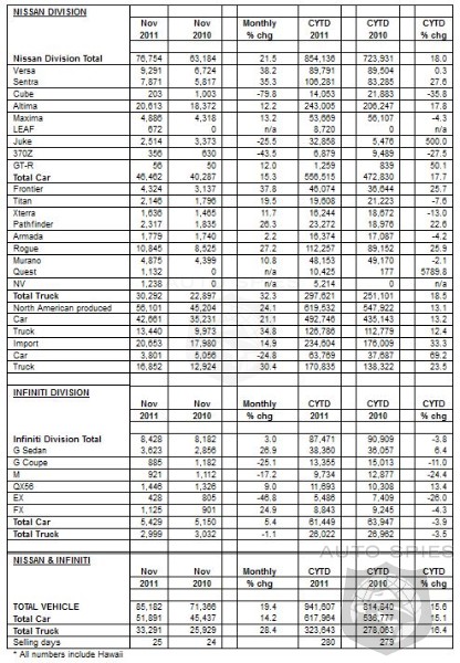 NOTE: To ensure consistency in global sales reporting, Nissan North America calculates monthly variances on a straight-percentage basis, unadjusted for the number of selling days. November 2011 had 25 selling days, while November 2010 had 24 selling days.