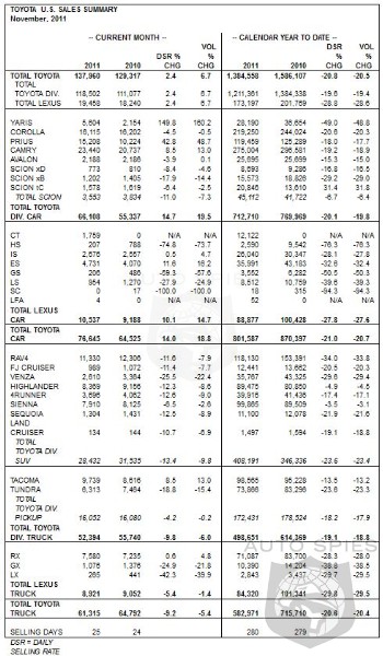 Toyota Motor Sales (TMS), U.S.A., Inc., today reported November sales of 137,960 units, an increase of 2.4 percent compared to the same period last year on a daily selling rate (DSR) basis. On a raw volume basis, unadjusted for 25 selling days in November 2011 versus 24 selling days in November 2010, TMS sales were up 6.7 percent over the year-ago month. The Toyota Division posted November total sales of 118,502 units, an increase of 2.4 percent on a DSR basis over November 2010. On a raw volume basis, Toyota Division sales were up 6.7 percent over the year-ago month. The Lexus Division reported total sales of 19,458 units, up 2.4 percent over November 2010, on a DSR basis. Volume-wise, Lexus Division sales were up 6.7 percent over last November.