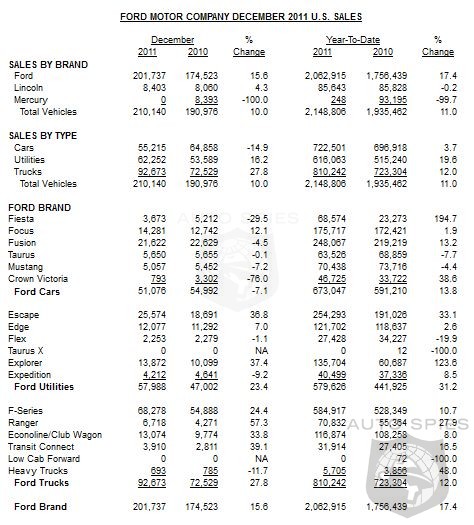 In December, Ford brand sales were 201,737, up 16 percent from a year earlier. Ford sold 68,278 F-Series pickups in December, representing its best December sales results since 2006. For the year, F-Series sales totaled 584,917 trucks, making it the only vehicle to break the 500,000 vehicle sales mark last year.