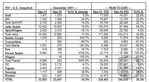 Volkswagen of America, Inc. today reported 324,402 units sold in 2011, a 26.3 percent increase over prior year sales. December sales totaled 32,502, up 36.2 percent over 2010, marking the best December since 1972.