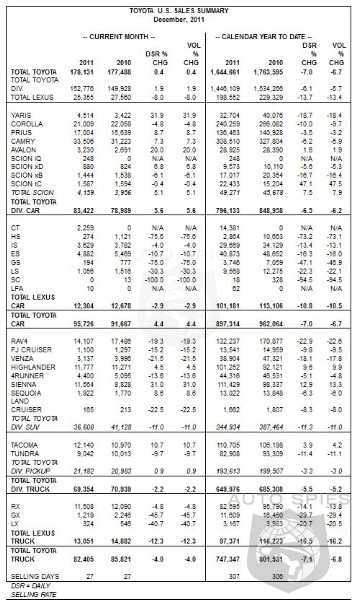 Toyota Motor Sales (TMS), U.S.A., Inc., today reported December 2011 sales results of 178,131 units, flat compared to the same period last year on a daily selling rate (DSR) basis and raw volume basis. Toyota Division reported December sales of 152,776 units, up 1.9 percent over 2010. Lexus Division reported sales of 25,355 units, down 8.0 percent from the year-ago month.