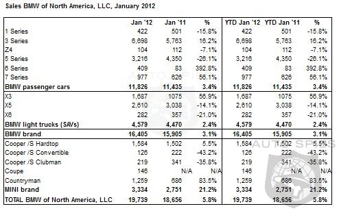 Sales of BMW brand vehicles increased 3.1 percent in January for a total of 16,405 compared to 15,905 vehicles sold in January, 2011.