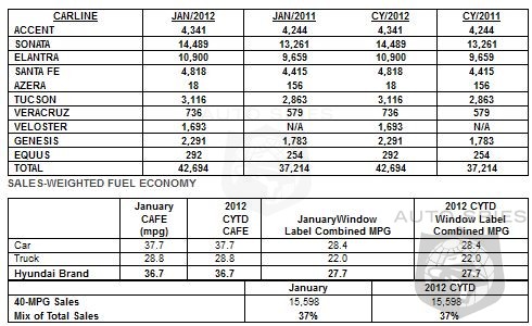 Hyundai Motor America today announced all-time record January sales of 42,694 units, up 15 percent versus 2011. Despite continued tight availability at Hyundai dealers across the nation, January retail sales were up 19 percent from last year due to continued strong performance throughout the Hyundai line-up, with the hot-selling Elantra up 13 percent and Genesis/Equus sales up 27 percent over last year. Fleet mix remains low at nine percent as the focus remains on optimizing dealer throughput and meeting consumer demand given ongoing production capacity constraints.