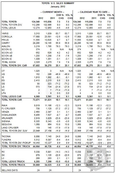 Toyota Motor Sales USA Inc. reported monthly sales results of 124,540 units as momentum from the fourth quarter of last year picked up speed in January. With 24 selling days in January 2011 and 2012, sales increased 7.5 percent over the year-ago month on a daily selling rate (DSR) and unadjusted raw volume basis. Driven by an increase in sales of the all-new 2012 Camry and Camry hybrid, the Toyota Division posted January sales of 112,266 units, an increase of 9.0 percent compared to the same period last year. The Lexus Division reported sales of 12,274 units, down 4.6 percent from last January.