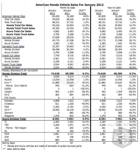 American Honda Motor Co., Inc., today reported January 2012 monthly new-vehicle sales of 83,009, an increase of 8.8 percent over January 2011. The Honda Division posted January 2012 sales of 74,628, an increase of 9.3 percent year-over-year.
