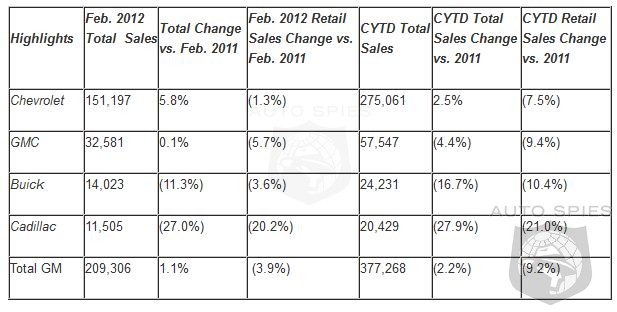 General Motors Co. (NYSE: GM) today reported total sales of 209,306 vehicles in February, up 1.1 percent compared with the company’s very strong February 2011 results. “Chevrolet’s 6 percent sales increase, which was driven by new models, as well as a stronger economy, helped GM exceed last February’s remarkably strong result,” said Don Johnson, vice president, U.S. Sales Operations. “It’s an affirmation of our progress. We are continuing to execute the same disciplined sales strategy that was the key to our success in 2011.”