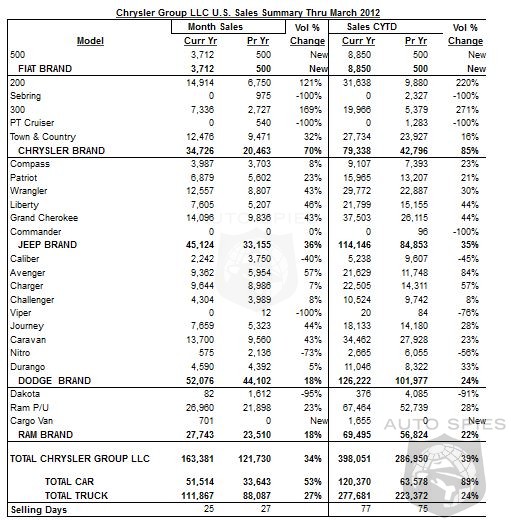 Chrysler Group LLC today reported U.S. sales of 163,381 units, a 34 percent increase compared with sales in March 2011 (121,730 units), and the group's best monthly sales in four years.