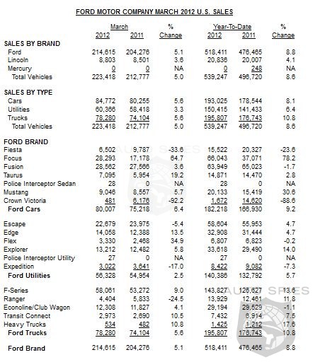 For the first quarter, Ford Motor Company's sales were up 9 percent versus year-ago levels, totaling 539,247 vehicles sold. The increases were driven by the popularity of Ford's most fuel-efficient models posting record sales months.