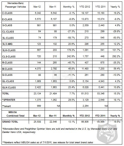 Mercedes-Benz USA (MBUSA) today reported a record March with sales of 23,134 for its Mercedes-Benz models, a 7.7 % improvement over March 2011 leading to the highest first quarter volume on record with sales of 61,513, up 15.3%. Combined sales of Mercedes-Benz passenger vehicles, smart and Sprinter for the month totaled 25,508, up 13.1%, and for the year-to-date 66,906, up 19.5 %. "With the combination of strong sales performance in our volume model lines and a whole new generation of Mercedes-Benz products in the pipeline, we are ideally positioned to take advantage of the strengthening market and take the brand to new places," said Steve Cannon, president and CEO of MBUSA.