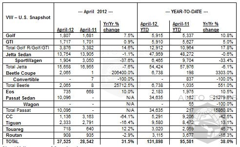 The 2012 Beetle, recently named to Ward's list of "10 Best Interiors," sold 2,065 units. The Beetle TDI Clean Diesel Coupe will go on sale late summer 2012. The Tiguan continued to see strong sales with 2,333 units sold and the Golf saw a 14.6 percent increase in sales with a total of 3,876 units sold.