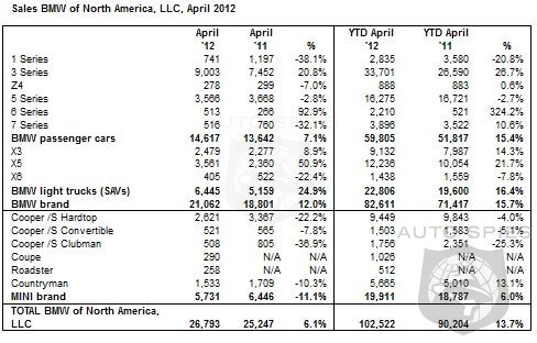 The BMW Group in the U.S. (BMW and MINI combined) reported April sales of 26,793 vehicles, an increase of 6.1 percent from the 25,247 vehicles sold in the same month a year ago. Year-to-date, BMW Group is up 13.7% on sales of 102,522 in the first four months of 2012 compared to 90,204 in the same period in 2011. "The momentum of the first quarter proved strong enough to give us a good result in April and I expect solid growth to continue through the rest of Spring and into Summer," said Ludwig Willisch, President and CEO, BMW of North America. "There's no shortage of desire in the market, now it's all about having the right models and being able to meet growing demand."