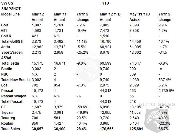 The Beetle continues to gain sales with 3,002 units sold, the best May since 2002, while the Golf and GTI sales totaled 3,878 units.