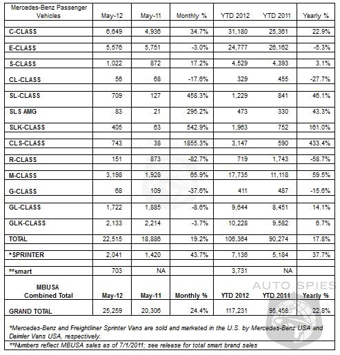 Mercedes-Benz USA (MBUSA) today reported May sales of 22,515 for its Mercedes-Benz models, a 19.2 % improvement over May 2011, delivering a year-to-date total of 106,364 new vehicles to customers, up 17.8%. Combined sales of Mercedes-Benz passenger vehicles, smart and Sprinter for the month totaled 25,259, up 24.4% bringing a year-to-date total of 117,231, up 22.8 %, making this the company's highest May on record. Sales for the month of May were led by the C-, E- and M-Class model lines. The sporty C-Class – the gateway to the Mercedes-Benz brand on the car side for younger and first-time Mercedes-Benz buyers – took the lead with sales of 6,649, up 34.7% and the 9th generation E-Class followed with sales of 5,576. MBUSA's top-selling SUV, the M-Class, rounded out the top three with sales of 3,198, up 65.9% compared to May 2011. Other strong performers were the company's popular new CLS four-door coupe which at 743 saw sales growth of 1,855.3% and the all-new SLK roadster which increased 542.9% over May 2011 with sales of 405. Also, the all-new iconic sixth generation 2013 SL roadster, debuting in showrooms this month, posted sales of 709, an increase of 458.3%, and the SLS AMG supercar retailed 83 for the month, up 295.2% over the same period last year.