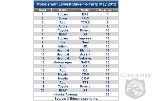 Just on sale, the Subaru BRZ and Toyota's Scion FR-S, in that order, topped Edmunds.com's list of quickest-selling vehicles in May. The list is based on Edmunds.com's calculation of days-to-turn; that is, the number of days a vehicle sits at the dealership before it is sold. The BRZ took a scant four days to sell; the FR-S only five days. In other words, their tires barely hit the pavement before someone drove them home. By comparison, industry wide, it took an average of 53 days to sell a vehicle.