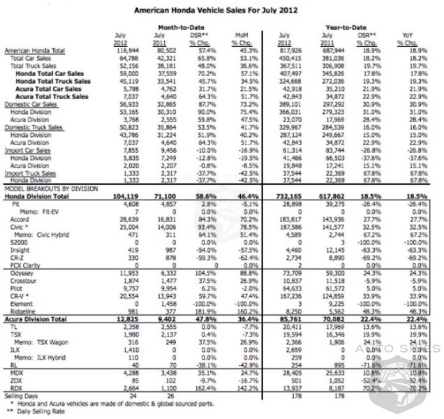American Honda today reported July 2012 U.S. sales of 116,944 units, an increase of 45.3 percent compared with July 2011 (an increase of 57.4 percent based on the daily selling rate*). The Honda Division posted July 2012 sales of 104,119 units, an increase of 46.4 percent compared with July 2011. Acura's U.S. July sales of 12,825 units increased 36.4 percent compared with July 2011.
