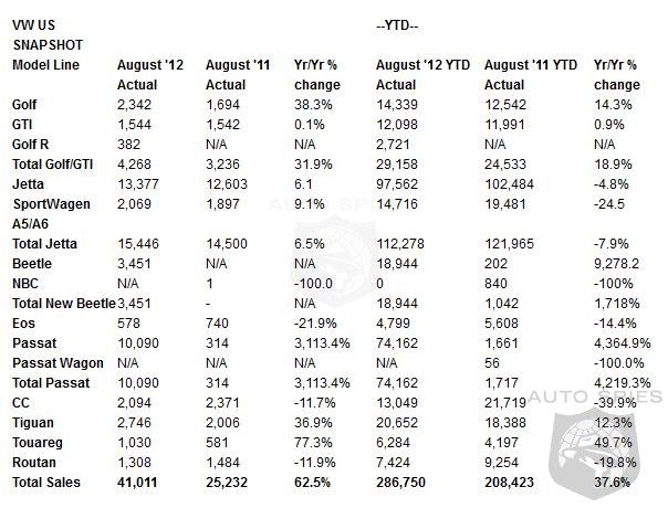 Volkswagen of America, Inc. (VWoA) today reported 41,011 units sold in August, a 62.5 percent increase over prior year sales, a 37.6 percent increase year-to-date and the best August since 1973.