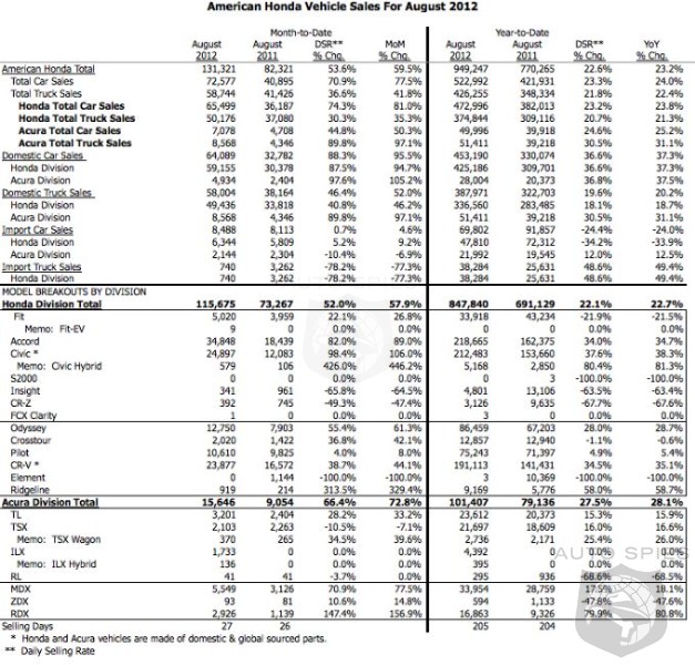American Honda today reported August 2012 U.S. sales of 131,321 units, an increase of 59.5 percent compared with August 2011 (an increase of 53.6 percent based on the daily selling rate*). The Honda Division posted August 2012 sales of 115,675 units, an increase of 57.9 percent compared with August 2011. Acura's U.S. August sales of 15,646 units increased 72.8 percent compared with August 2011.