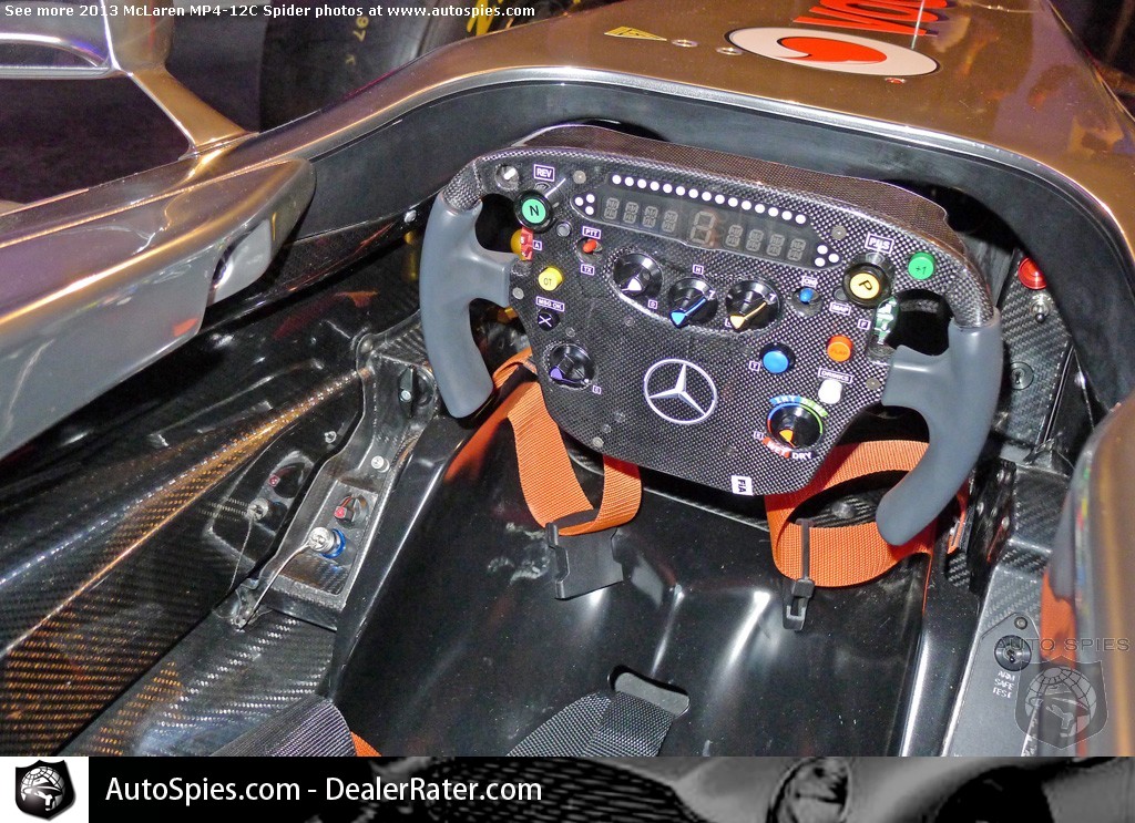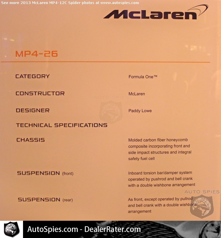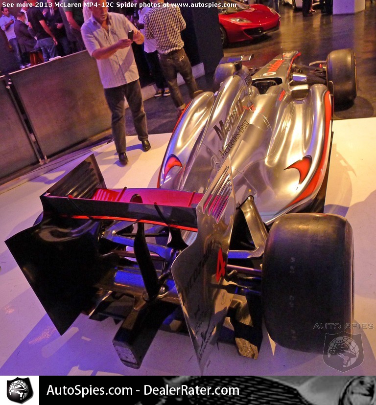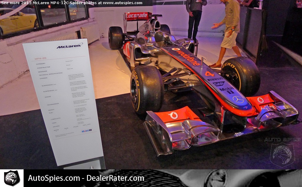 At the Classic Car Club in New York, McLaren's new 2013 MP4-12C Spider wasn't the only guest of honor. McLaren's MP4-26, driven by Lewis Hamilton and Jenson Button, was also in attendance.While I specialize in consumer products, I have to say to see a proper Formula One car in the flesh and up close is truly something special. Especially when it's a vehicle that two extremely accomplished drivers have piloted.For me there are thee areas that stand out to me:1) The steering wheel -- as we've seen in other racers, make note of all the settings piped through the steering wheel2) The rear diffuser -- It's amazing to see how an F1 car has been designed to move air around the vehicle3) The front suspension -- Just look at the set up with the carbon fiber bitsTake a look for yourself down below...2013 McLaren MP4-12C Spider Photo Gallery