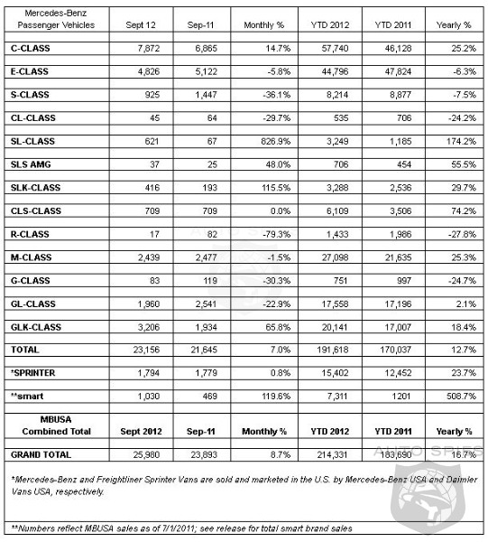 Mercedes-Benz USA (MBUSA) today reported record September sales of 23,156 for its Mercedes-Benz models, up 7%, delivering a record year-to-date total of 191,618 new vehicles to customers, up 12.7%. Combined sales of Mercedes-Benz passenger vehicles, smart and Sprinter for the month totaled a record for MBUSA of 25,980, up 8.7% bringing the year-to-date total to 214,331 up 16.7%.