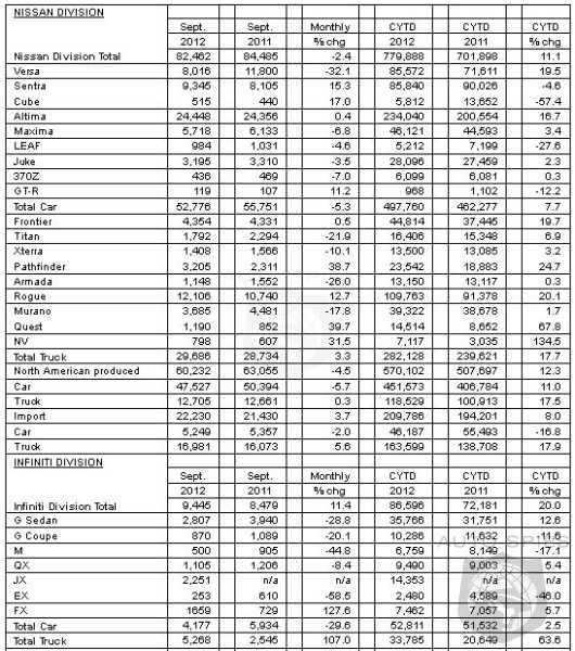 NOTE: To ensure consistency in global sales reporting, Nissan North America calculates monthly variances on a straight-percentage basis, unadjusted for the number of selling days. September had 25 selling days both in 2012 and 2011.