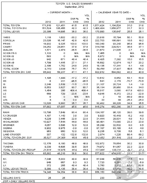 Toyota Motor Sales (TMS), U.S.A., Inc., today reported September 2012 sales results of 171,910 units, an increase of 41.5 percent compared to the same period last year on both a daily selling rate (DSR) and a raw volume basis, unadjusted for 25 selling days in both September 2012 and in September 2011. The Toyota Division posted September total sales of 151,524 units, an increase of 42.3 percent on a DSR basis from September 2011. On a raw volume basis, Toyota Division sales were also up 42.3 percent from the year-ago month.