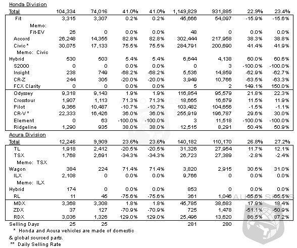 American Honda reports an all-time record for the month of November, with November 2012 U.S. sales of 116,580 units, an increase of 38.9 percent compared with November 2011. The Honda Division posted November 2012 sales of 104,334 units, an increase of 41.0 percent compared with November 2011. Acura U.S. November sales of 12,246 units represents an increase of 23.6 percent over November 2011. Honda