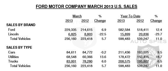 The company’s overall sales in March were up 6 percent with 236,160 vehicles sold. Cars were even with a year ago, utilities up 14 percent and trucks up 6 percent.