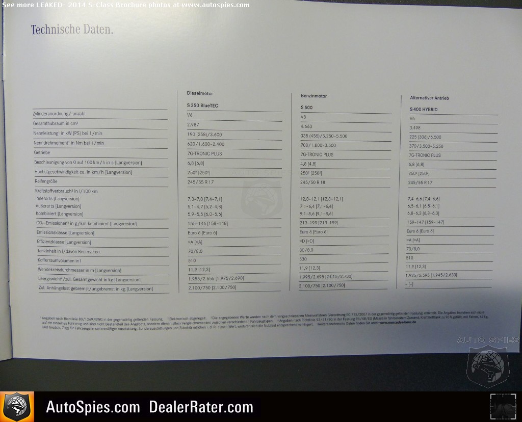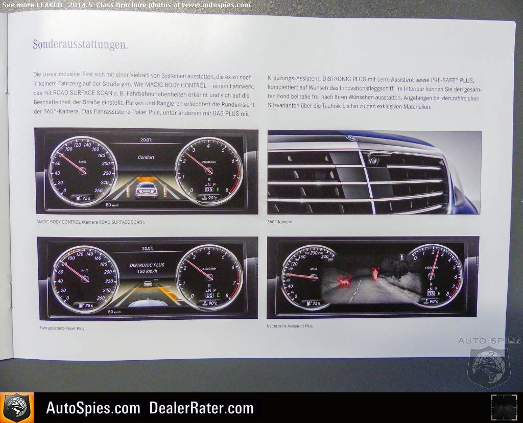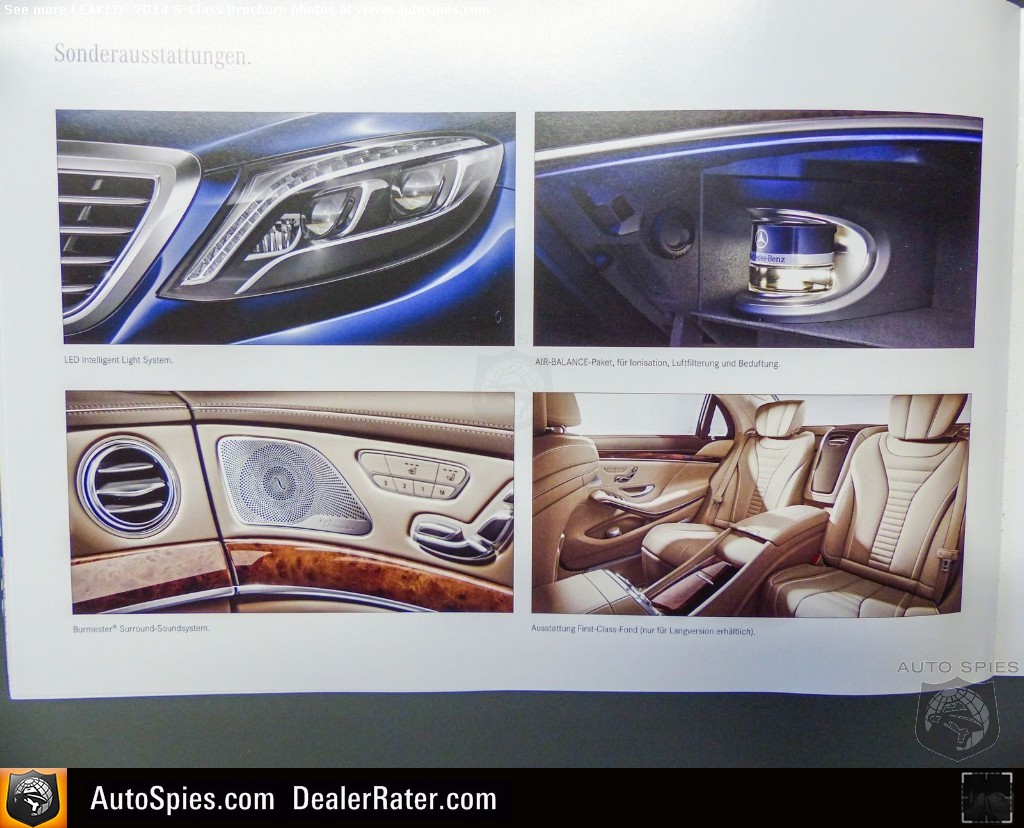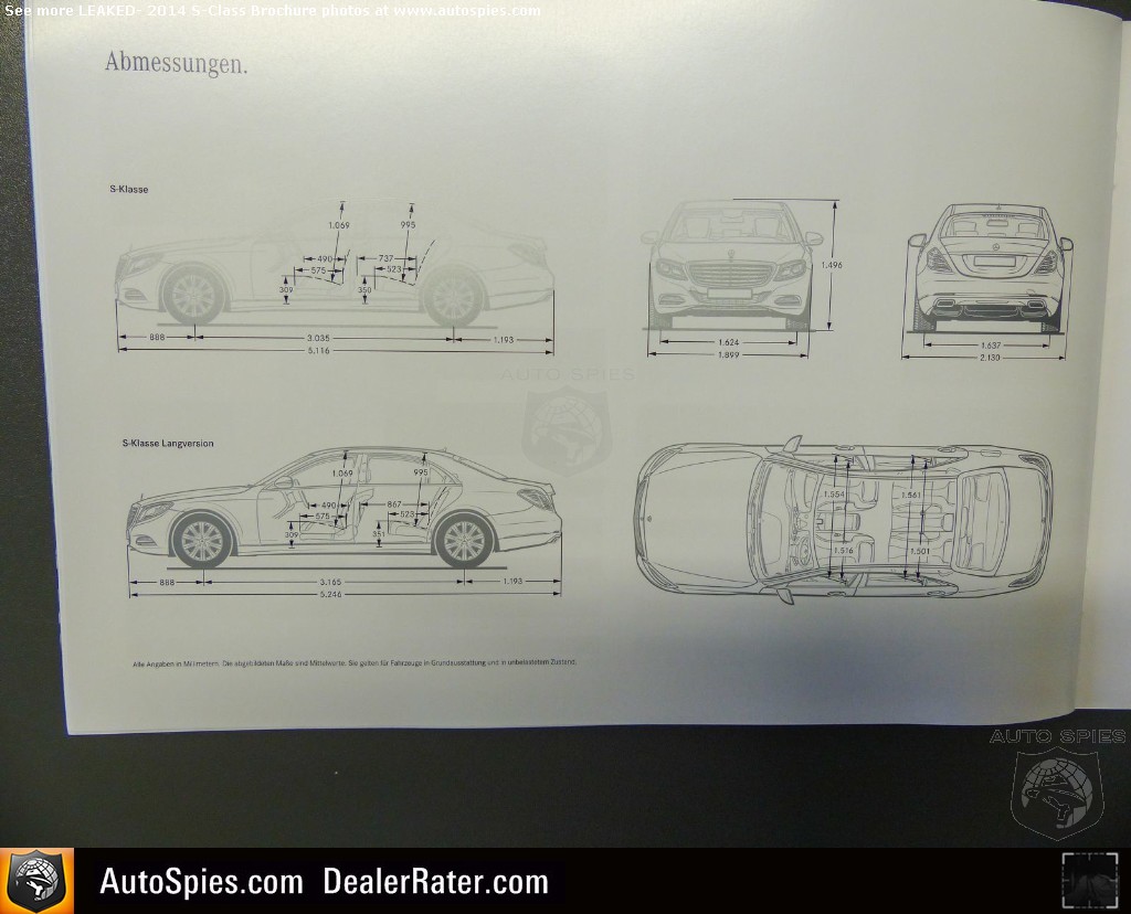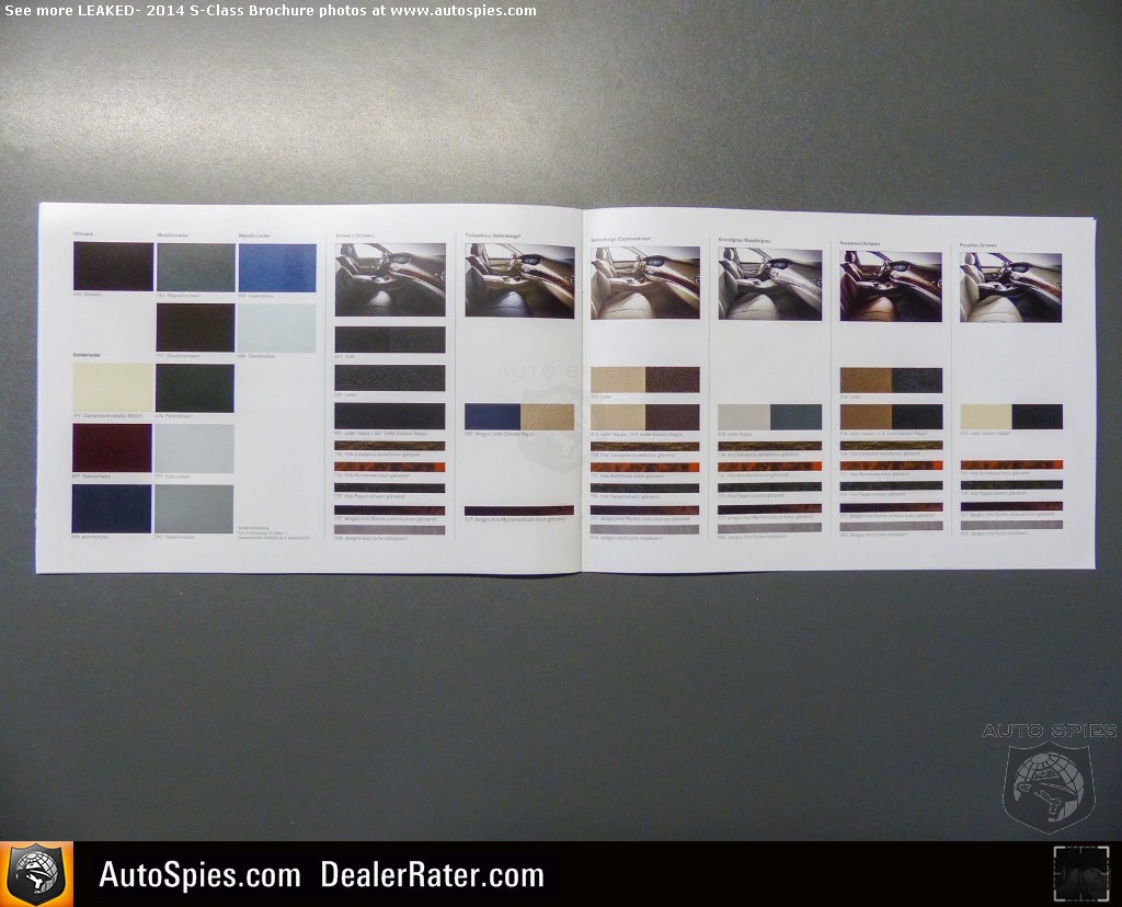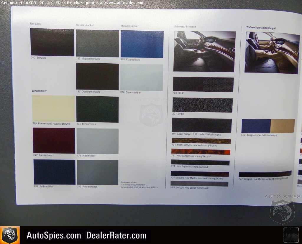 While new car debuts like the BMW 3-Series and 5-Series attracted a lot of attention, I can't remember ANY car getting as much coverage and had so much interest in an all-new debut than this. The 2014 Mercedes-Benz S-Class has been getting some serious love and the mystique surrounding the all-new product has slowly been dwindling.The secrets have slowly been coming out over the past several months, but each week it seems like this "dam" is starting to gush as more in-depth information makes its way out.Today the all-new S-Classes' brochure shots made their way onto the 'net. And we're seeing a lot. Color combinations are just the start as the vehicle's measurements are detailed. In addition, there are several photos that show the all-new S in new colors and angles not previously seen. Don't even get us started on the technology featurettes in the brochure. You have to see it for yourself.That said, take a scroll through the pictures below. They're the best you'll find.**Special thanks to eMercedesBenz and the Mercedes Passion blog.LEAKED! 2014 Mercedes-Benz S-Class Brochure Photo Gallery