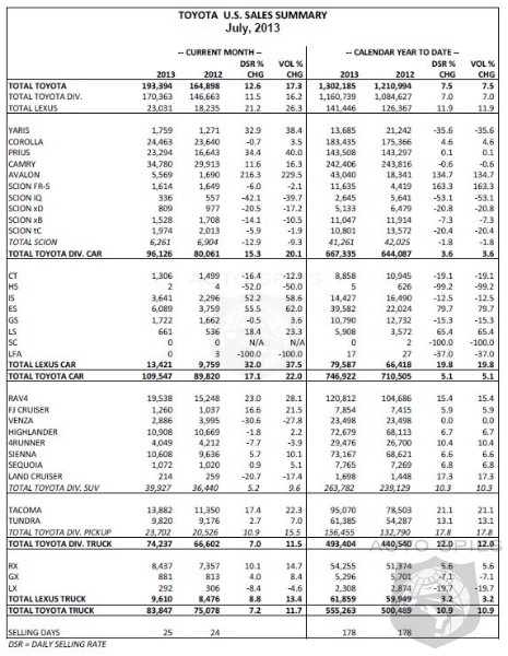 Toyota Division posted July 2013 sales of 173,063 units, up 11.5 percent year-over-year on a DSR basis. On a raw volume basis, Toyota Division sales were up 16.2 percent over the year-ago month.
