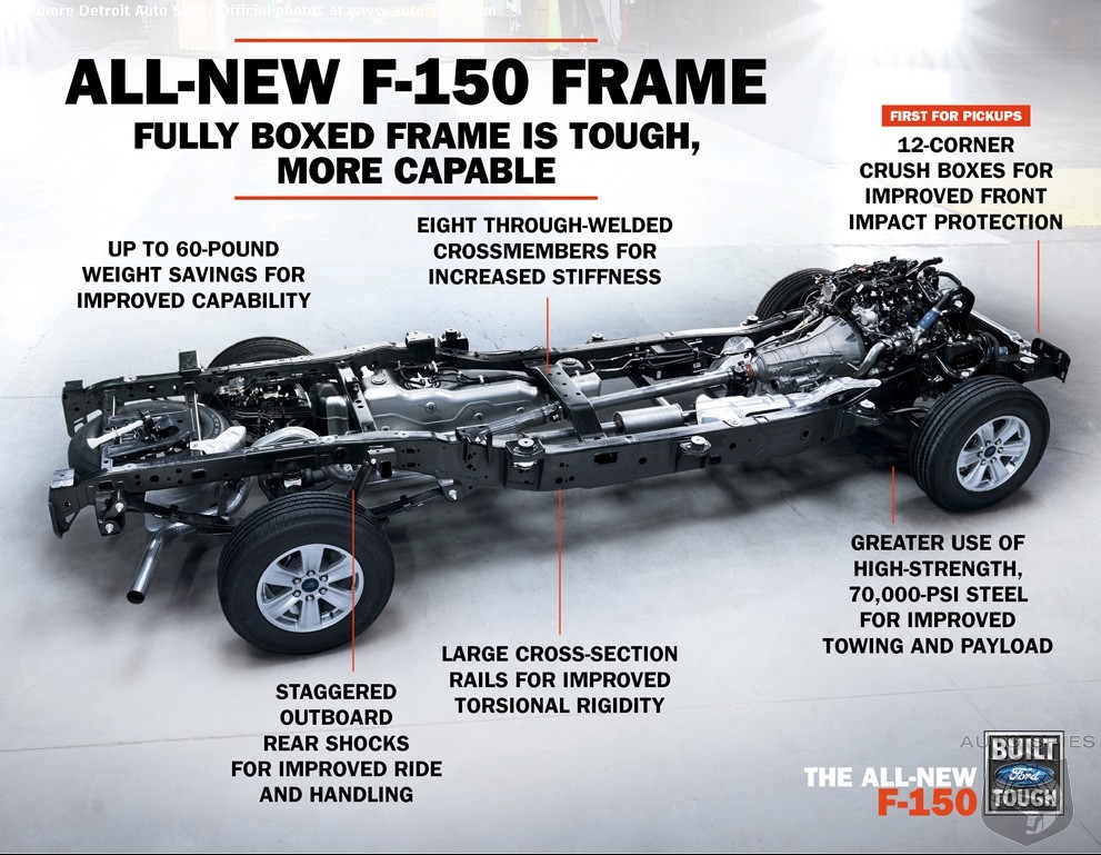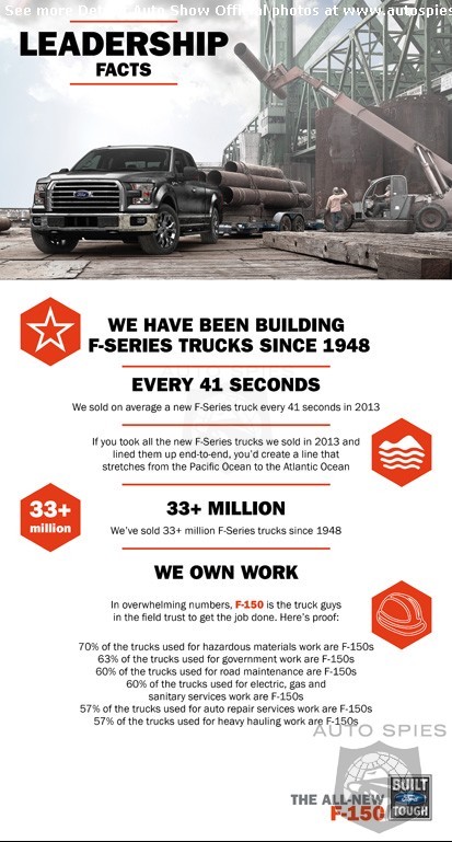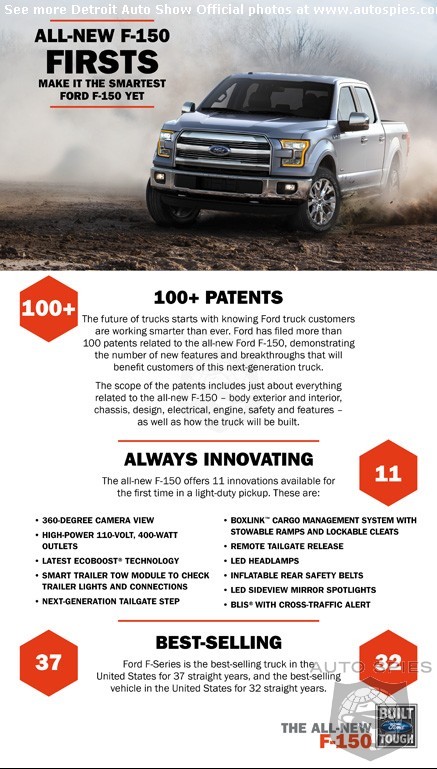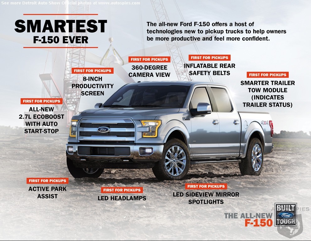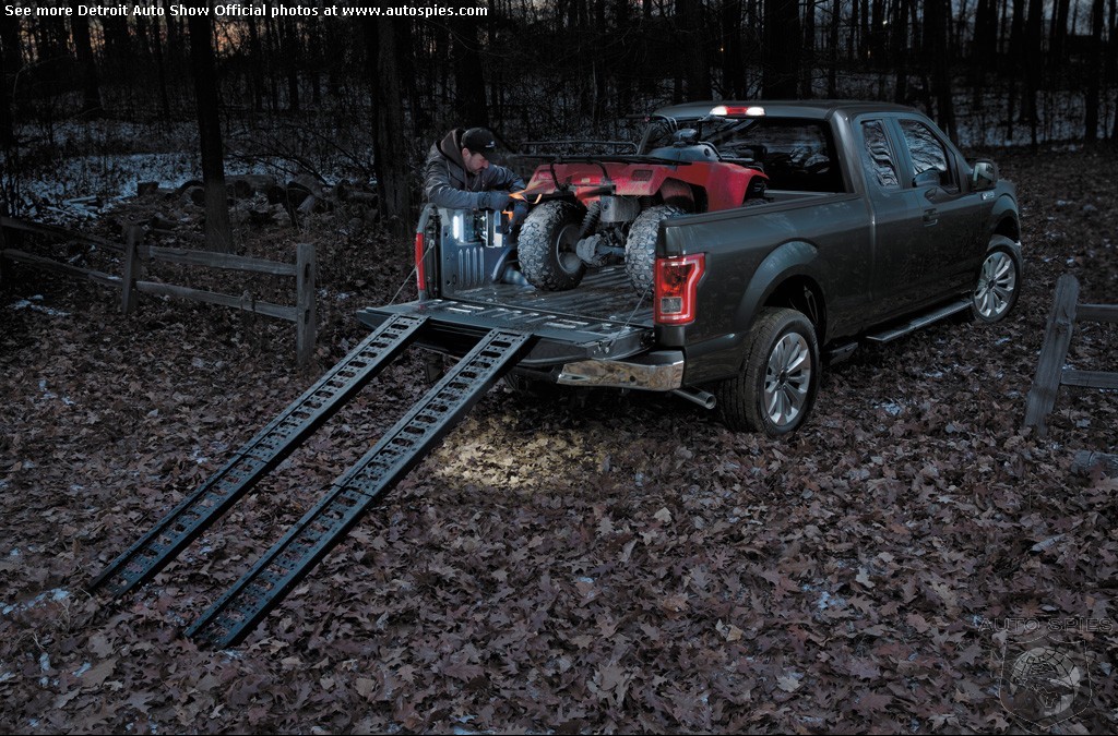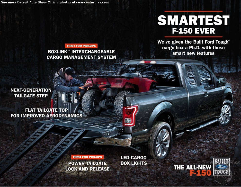 I imagine it's going to be pretty hard to top the 2015 Ford F-150 when it comes to the 2014 Detroit Auto Show (NAIAS) debuts. There's two reasons for this:1) The all-new F-150 is a SIGNIFICANT leap forward with its aluminum construction — contributing to substantial weight savings — focus on a more refined cabin and technological advancements over its competition. 2) This is a volume product. Have you ever seen the F-Series NOT in the Top 10 most sold cars, annually?That said, we have located the first video clip of the all-new F-150 in action. Check it out below.Buyers will have the choice of a new, naturally aspirated 3.5-liter V6 as standard, while the 2.7 will slot in above it. The 5.0-liter V8 remains, while the 3.5-liter EcoBoost V6 has finally knocked off Ford's bad-boy 6.2-liter V8, which will no longer be offered on the F-150.**Keep your browser pointed to AutoSpies.com for the latest breaking news leading up to the 2014 Detroit Auto Show (NAIAS)Lexus is the exclusive sponsor of the 2014 Detroit Auto Show Photo Galleries.2014 Detroit Auto Show