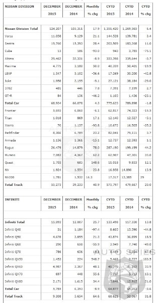 Nissan Group today announced total U.S. sales for December 2015 of 139,300 units, an increase of 19 percent over the prior year and a December record. For calendar year 2015, Nissan set an all-time record with 1,484,918 total U.S. sales, an increase of 7 percent.Nissan Division calendar year highlights:
