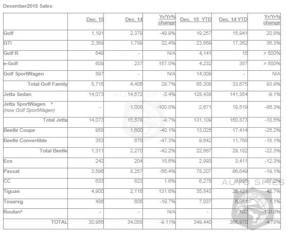 Volkswagen of America, Inc. (VWoA) today reported sales of 30,956 units delivered in December 2015. Sales for 2015 total 349,440 units.The Tiguan produced the best month on record for the vehicle with 4,900 vehicles delivered, a 131.6 percent increase. In 2015, Tiguan deliveries totaled 35,843 units, a 42.7 percent increase versus 2014, this marks the best year on record for the vehicle.