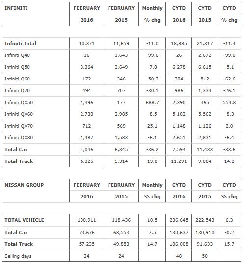 The new QX50 luxury crossover had its best February with an increase of 688.7 percent to 1,396 units. In all, Infiniti crossovers and sport utility vehicles were up 14.7 percent over prior year.