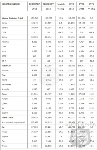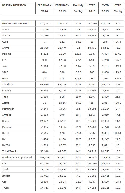 - Nissan Division finished February with 120,540 sales, up 13 percent and also a February record.