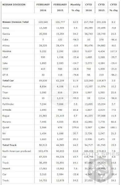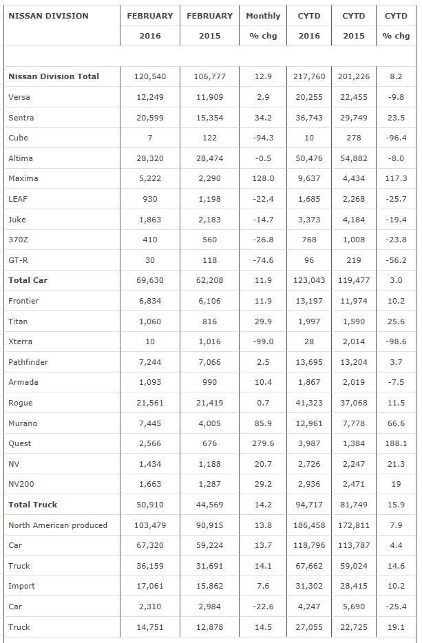 - Nissan Division finished February with 120,540 sales, up 13 percent and also a February record.
