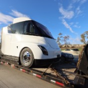 A new Tesla Semi with a white paint job, updated window design, smoked headligh...