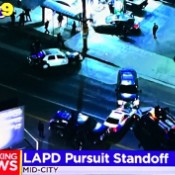 Two armored Ford Excursions driven by SWAT officers pin the suspect's vehicle in...