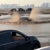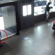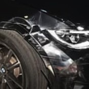 The shocking video showed the black BMW hitting two cars before jumping the curb...