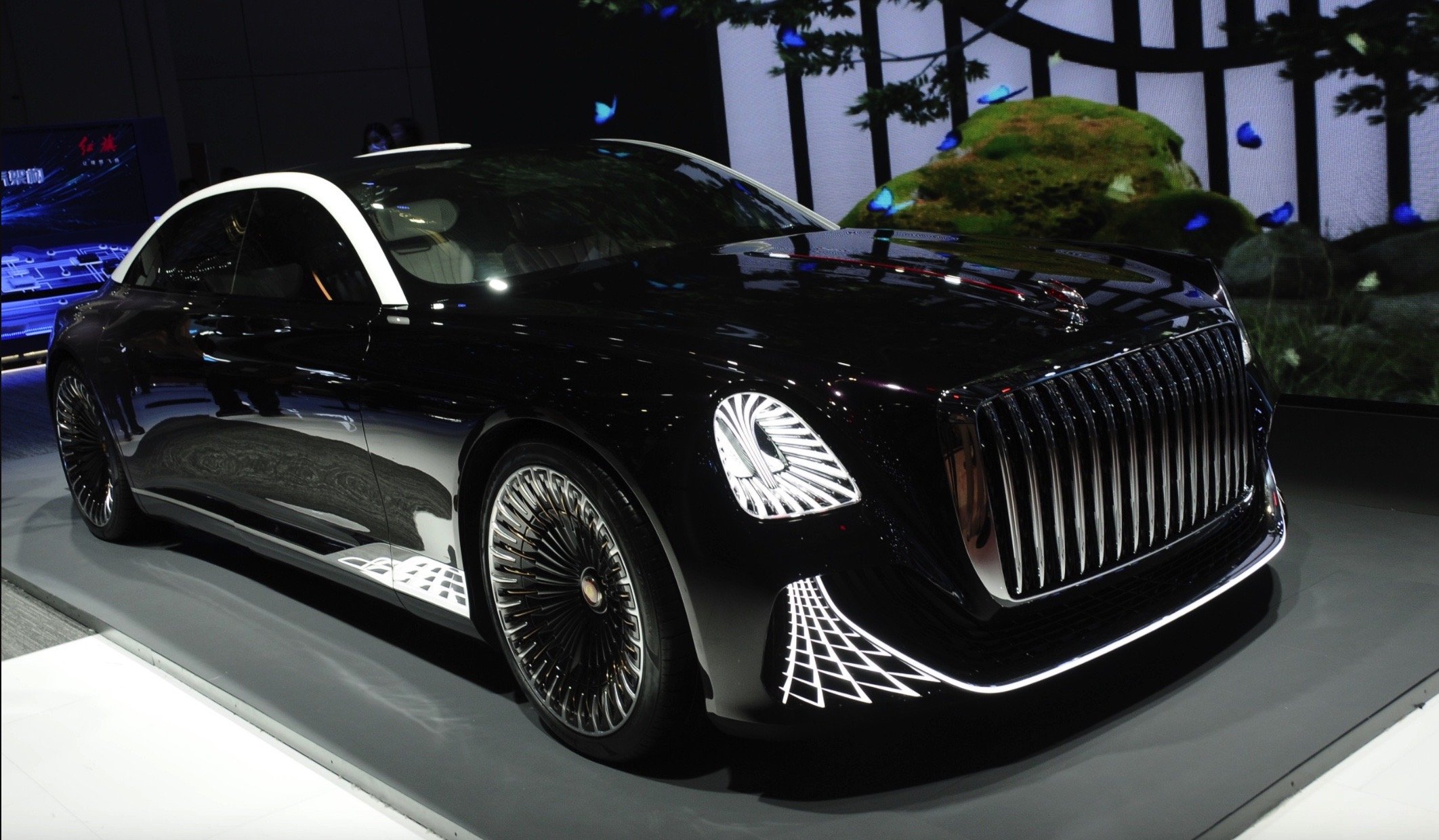 Another interior feature worth mentioning is the chandelier suspended between the rear seats, which joins the brilliant interior trim and countless LED lights to create a sparkling overall atmosphere. The two-tone leather upholstery looks perfect, however. Finally, the concept lacks a steering wheel, which probably suggests that it features some sort of autonomous driving system.
