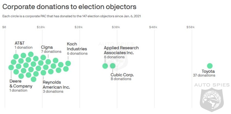 Nearly three-dozen corporate PACs have donated at least $5,000 to Republicans who objected to certifying the 2020 election, yet Toyota leads by a substantial margin.