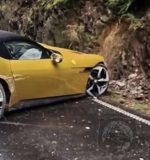 What makes this incident even juicier? It allegedly happened during a press event in Luxembourg, and it’s apparently the first reported crash of Ferrari’s newest V12 masterpiece. Details are scarce, including who was behind the wheel or how exactly things spiraled into oops-territory, but the mangled metal seen in this photo shared by Supercar.fails, speaks for itself. The crash occurred on a narrow, rain-soaked road, leaving the supercar with extensive damage.