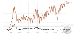 The share of subprime borrowers at least 60 days behind on their auto loans rose to 6.65% in October, the highest level on record, according to Fitch Ratings data going back to the early 1990s.