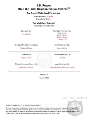 "Strong wholesale retention, solid brand value and a disciplined approach on rental fleet and incentives propelled Toyota to the top spot among mainstream brands," said Danny Battaglia, managing director of ALG customer success at J.D. Power. "Toyota topped six segments for 2026, including a four-peat for GR Supra and five-peat for Tundra. Meanwhile, Tesla avoided the high incentives of other luxury battery electric vehicle brands in 2025. That helped earn it the top rank among luxury brands with the highest performers in three segments–including the refreshed Model Y, which included introduction of a lower-priced base version and additional content on midlevel trims.”