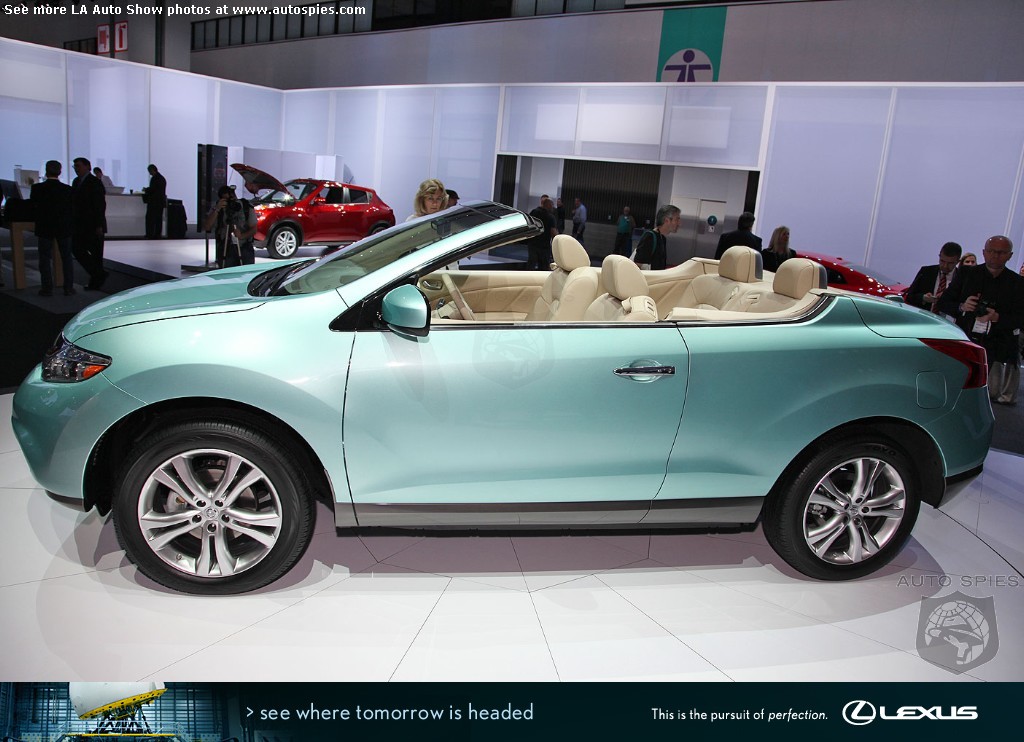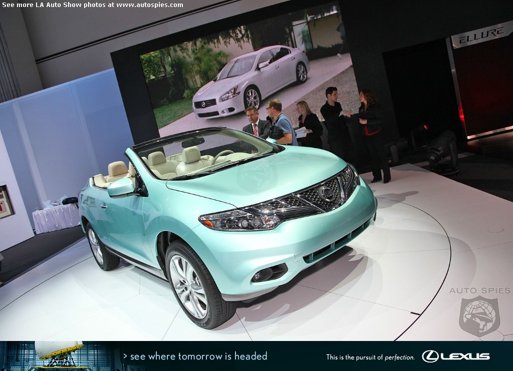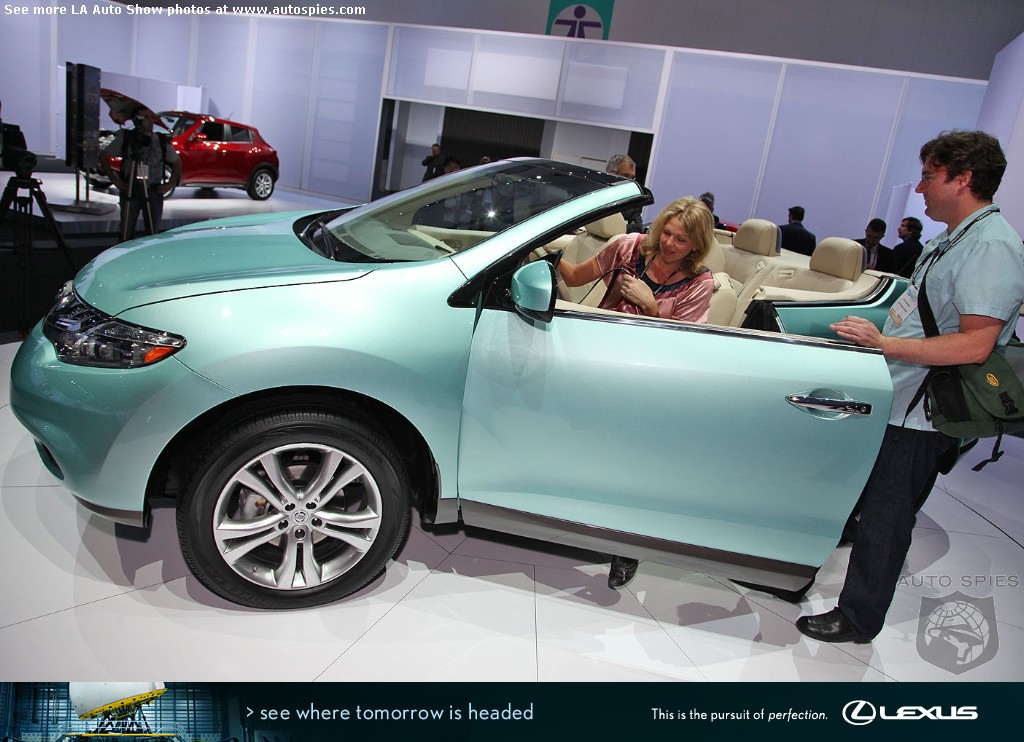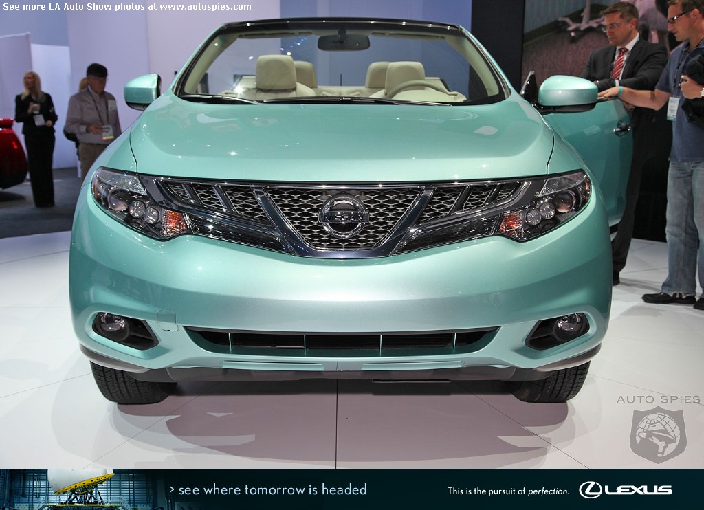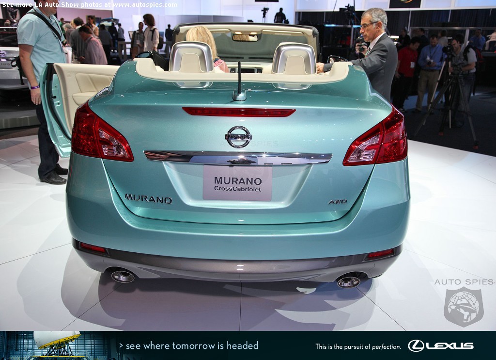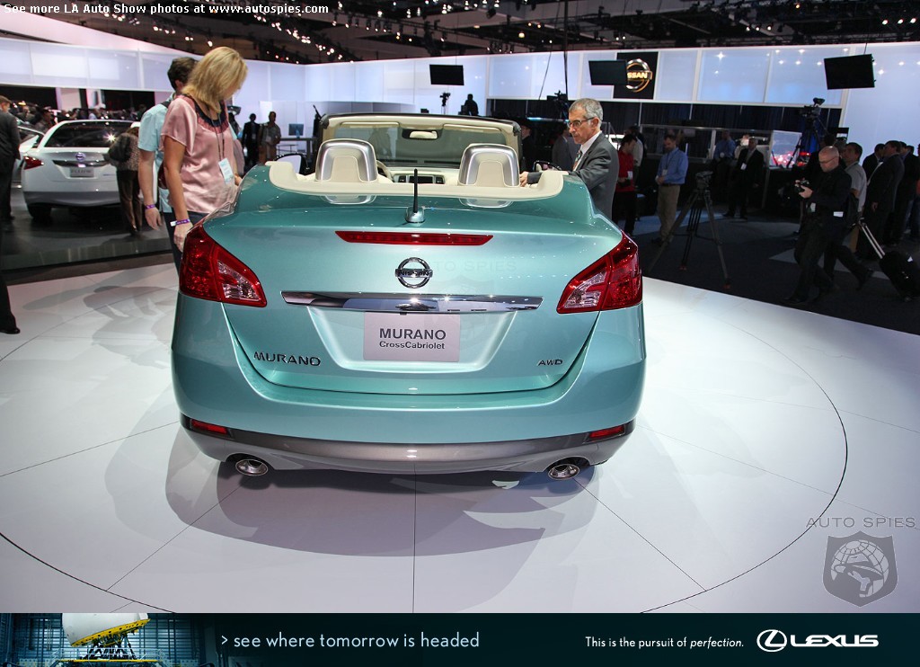The car that most people thought would look like a bigger trainwreck in Los Angeles than Lindsay Lohan was the Nissan Murano CrossCabriolet. The automotive press only knew Nissan was going to chop the top off.No one knew if that meant that there would be two doors, four doors or a gigantic roll bar. Whatever it would be, I am pretty sure not one single person expected this. A Nissan Murano trying desperately to be a 370Z Roadster with two extra seats that are functional.That's the thing though, no one can figure out who was asking for this. But if it has more space and room for your gear, this may just be the most practical convertible yet. If that's the case, you can bet other automakers will soon follow Nissan's lead.Hell, even Audi had a similar concept way back in 2007. Nissan just took the ball and didn't look back!**Stay tuned to AutoSpies as photos from the 2010 Los Angeles Auto Show pour in. Agent001's trigger finger has been itchin' for LALexus is a proud sponsor of the AutoSpies 2010 Los Angeles Auto Show photo gallery.2010 LA Auto Show Photo Gallery2010 LA Auto Show Photo Gallery2011 Chrysler Group Photo Gallery2010 LA Auto Show Preview Photo Gallery2010 SEMA Auto Show Photo GallerySEMA Auto Show Preview Photo GalleryAutoSpies.com Photo GalleriesIf you want to see your photos running on our homepage photo ticker, be sure to upload your photos on the go by sending them to Mobile@AutoSpies.com Share on Facebook