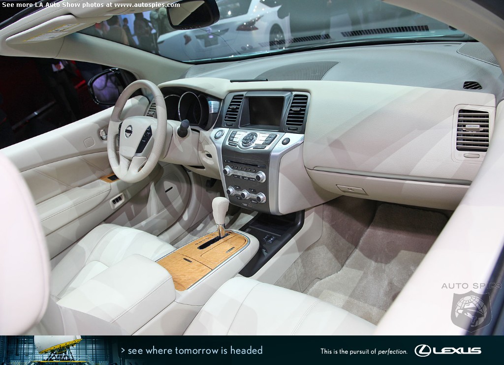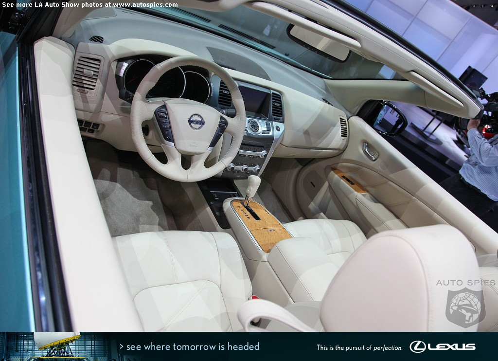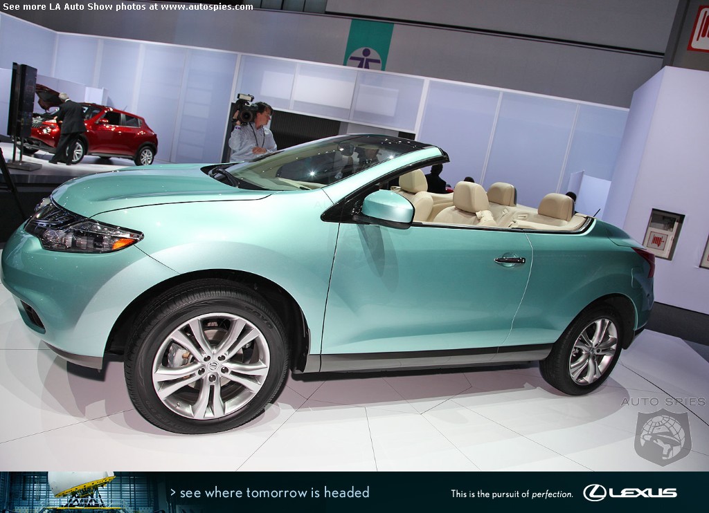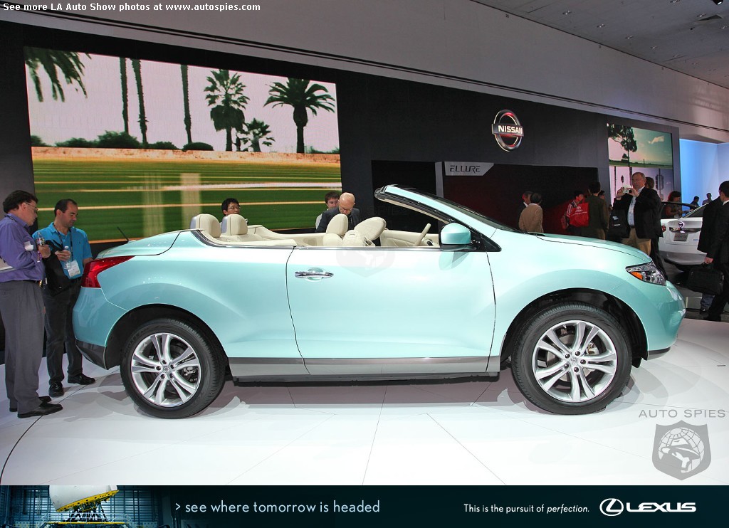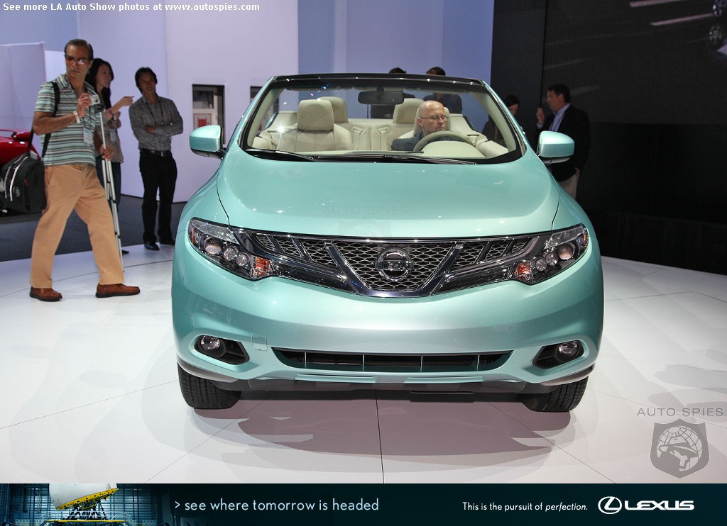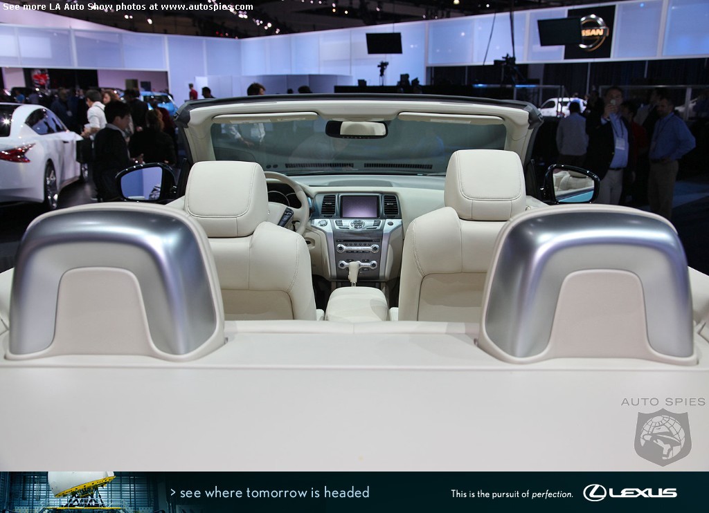 The car that most people thought would look like a bigger trainwreck in Los Angeles than Lindsay Lohan was the Nissan Murano CrossCabriolet. The automotive press only knew Nissan was going to chop the top off.No one knew if that meant that there would be two doors, four doors or a gigantic roll bar. Whatever it would be, I am pretty sure not one single person expected this. A Nissan Murano trying desperately to be a 370Z Roadster with two extra seats that are functional.That's the thing though, no one can figure out who was asking for this. But if it has more space and room for your gear, this may just be the most practical convertible yet. If that's the case, you can bet other automakers will soon follow Nissan's lead.Hell, even Audi had a similar concept way back in 2007. Nissan just took the ball and didn't look back!**Stay tuned to AutoSpies as photos from the 2010 Los Angeles Auto Show pour in. Agent001's trigger finger has been itchin' for LALexus is a proud sponsor of the AutoSpies 2010 Los Angeles Auto Show photo gallery.2010 LA Auto Show Photo Gallery2010 LA Auto Show Photo Gallery2011 Chrysler Group Photo Gallery2010 LA Auto Show Preview Photo Gallery2010 SEMA Auto Show Photo GallerySEMA Auto Show Preview Photo GalleryAutoSpies.com Photo GalleriesIf you want to see your photos running on our homepage photo ticker, be sure to upload your photos on the go by sending them to Mobile@AutoSpies.com Share on Facebook