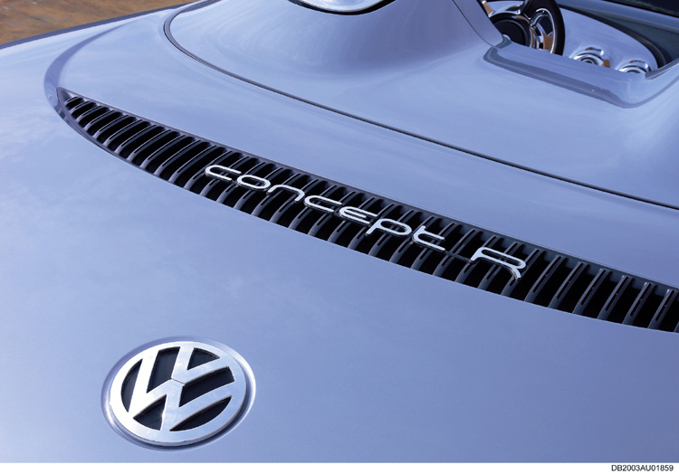 The flank of the concept R is distinguished by: a very flat waistline, rising to the centre of the rear wheelarches; naturally round, heavily contoured wheelarches; and a very short rear overhang. The new design is also continued here with its own fascination in form and function. And again the term three dimensionality comes to light. Inline with the New Beetle, there are just three prominent lines that form the silhouette of the concept R: Two semi-circles each for the high rise of the wheelarches and one straight line closing to a semi-circle at the rear of the waistline.