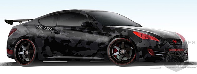 Hyundai has given their Genesis Coupe to 'Street Concepts', long-time Hyundai tuners, who have decided to give the entire car a camouflage paintjob with red-tinted headlights at the front.
