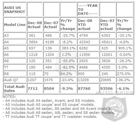 Audi today announced sales for the month of December totaling 7,712 units. Despite a challenging marketplace, Audi appears to have outpaced most brands and will record market share increases for December and all of 2008.