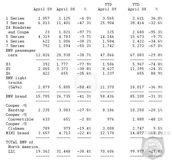 The BMW Group in the U.S. (BMW and MINI combined) reported April sales of 19,362 vehicles, a decrease of 38.4 percent from the 31,448 vehicles sold in the same month of 2008. The BMW Group also reported a year-to-date sales volume of 70,606 vehicles, down 29.4 percent, compared to 99,977 vehicles sold in the same period a year ago. Despite the negative development in April, both BMW and MINI continue to track better than their market segments year-to-date.
