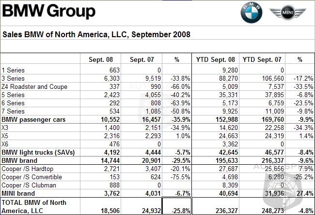 BMW's automobile sales are down 35.9 percent in September to 10,552 versus 16,457 in the same month a year ago. Year-to-date sales also decreased 9.9 percent, to 152,988 automobiles compared to 169,760 in the same period of 2007.